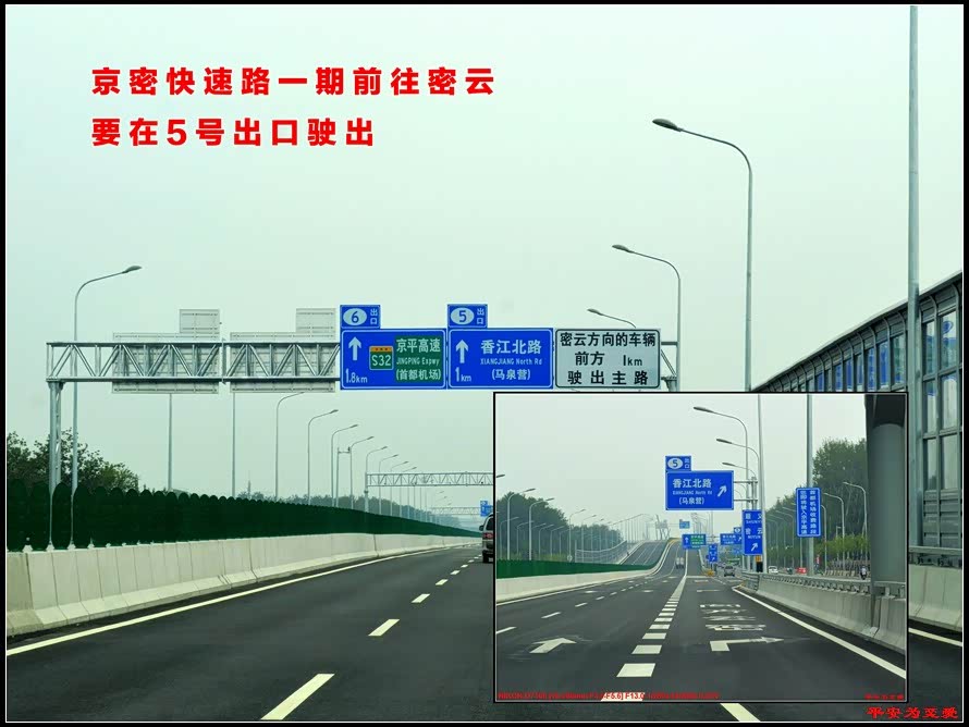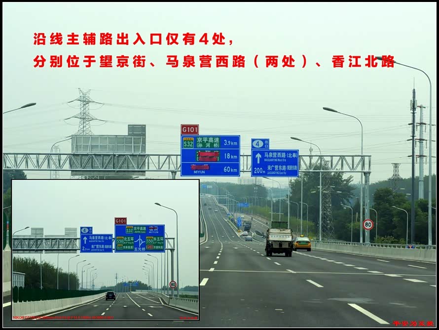 京密快速一期全程几乎都是高架,所以出入口相对较少,只有四处,行驶在这路上,有点跑高速的感觉。