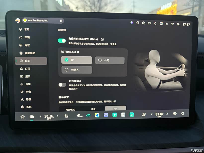 由于梁哥家住在“保安里”,算是老旧小区,也没有所谓的物业和监控,这就让停车变得有些焦虑了,尤其现在还快过年了,车多起来了,更得小心。虽说朋友小区没有监控,但我这台车有哨兵模式,所以停车也不需要过于担心。虽说开哨兵模式心里踏实,但一直开哨兵模式就会有点费电,要是为了安全而影响续航而频繁充电就尴尬了。好在它的哨兵模式可以选择性开启,就比如说我在我家车库停车时可以设置不开启哨兵模式,除了家和公司之外的地方可以开启这项功能,这样可以在一定程度上节省电量,保证出行续航。