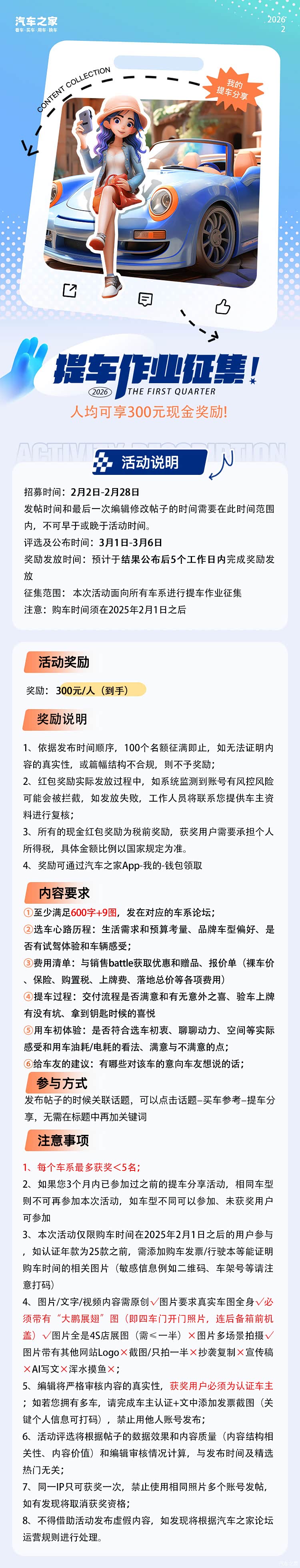 2、如果3个月内已参加过之前的提车分享活动,相同车型则不可再参加本次活动,如车型不同可参加,未获奖用户可参加
