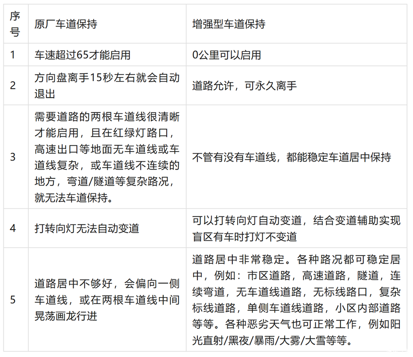 增强型车道保持系统能力上秒杀原厂车道保持,对其是降维打击;以下简要列出几点对比