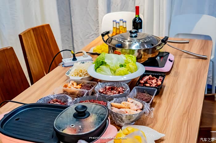 一切准备就绪,准备开餐,今晚有牛肉、鸡翅、牛扒、牛肉粒、金针菇、生菜、土豆、娃娃菜等等。当然美味的佳肴怎么能少得了酒?