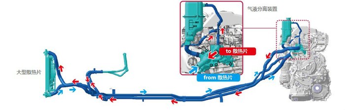 为了确保涡轮增压发动机的散热而采用专门大型散热器以及气液分离结构。