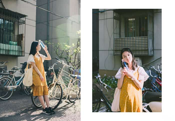在这样一些有很多自行车的地方,就可以让妹子轻轻靠在自行车上,