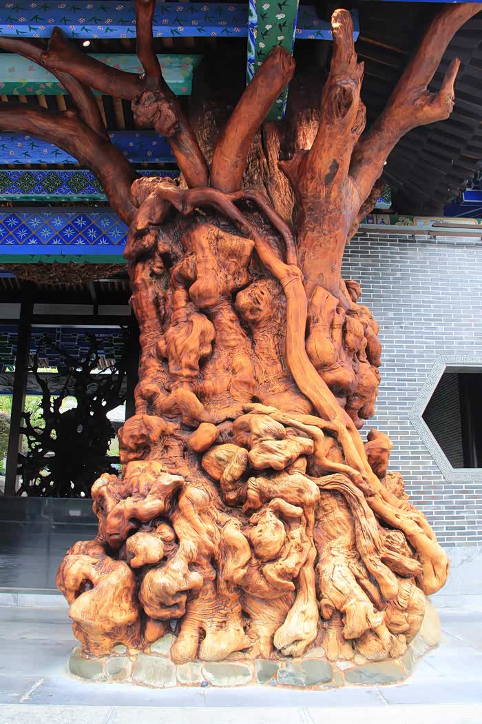 后来向景区工作人员询问才得知,这些作品均由整根大树雕琢而成,其原料是历经多年从国内外搜罗而来的,其中不少巨型根材源自缅甸。据介绍,这片融合了根雕艺术与园林景观的胜地,正朝着世界文化新遗产的目标稳步迈进。