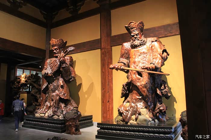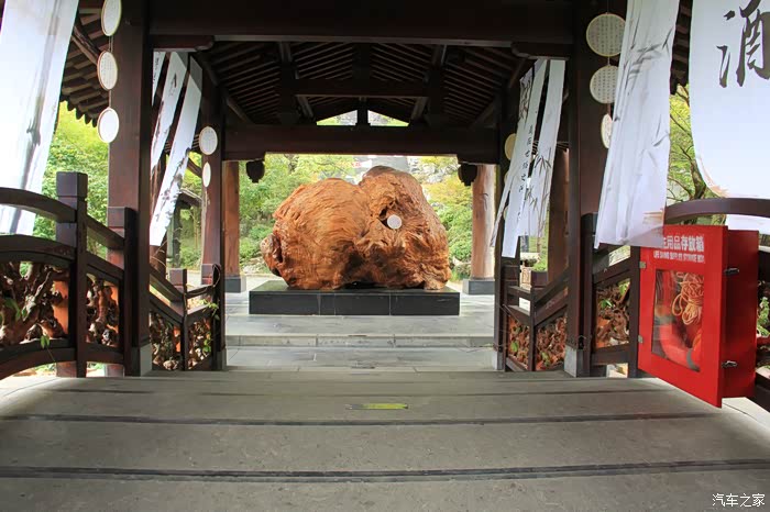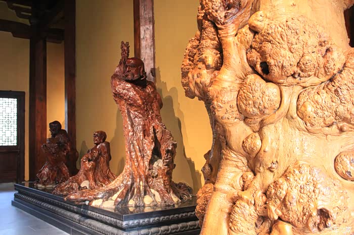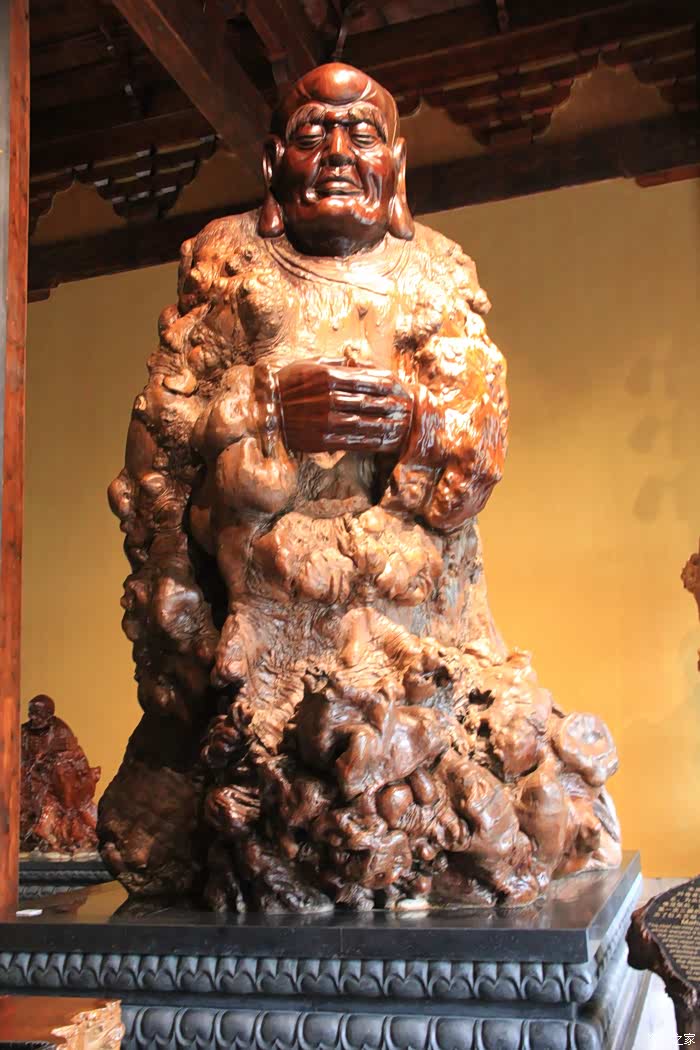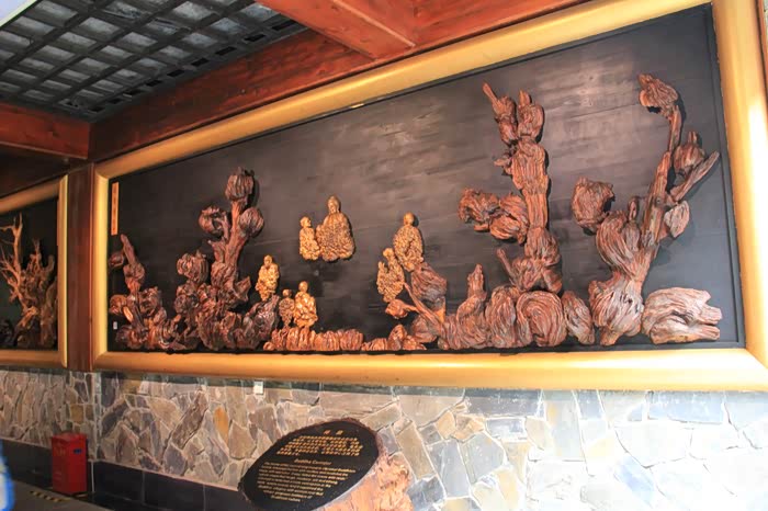 景区内的核心景点各具特色:“福门祥光”气势恢宏,踏入其间便觉祥瑞萦绕;“云湖禅心”湖水澄澈,岸边草木倒映其中,静谧宜人;天工博物馆与根雕佛国里陈列的大型根雕艺术作品更是精美绝伦,令人叹服。不少根雕原料直径粗达一两米,造型苍劲古朴,起初我们还暗自怀疑是拼接而成,询问景区工作人员后才得知,这些作品皆由整根大树雕琢而成,原料是历经多年从国内外搜罗而来,其中不少巨型根材源自缅甸。据介绍,这片集根雕艺术与园林景观于一体的胜地,正朝着世界文化新遗产的目标稳步迈进。
