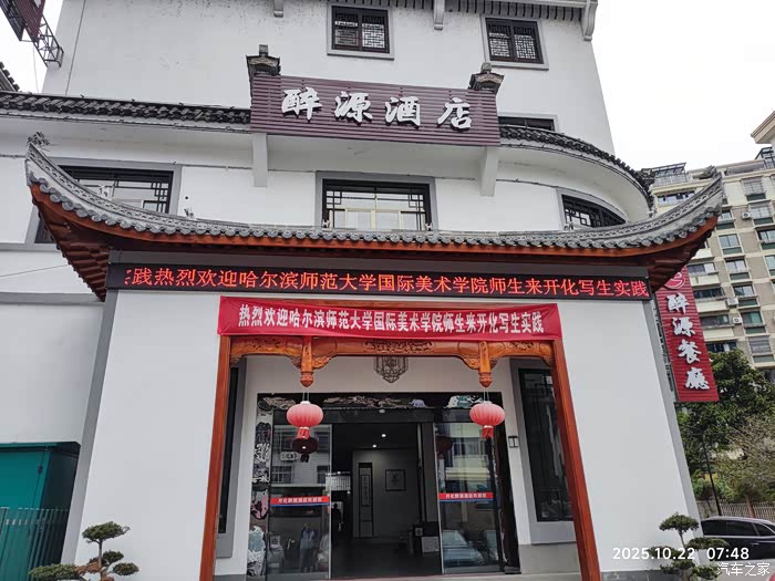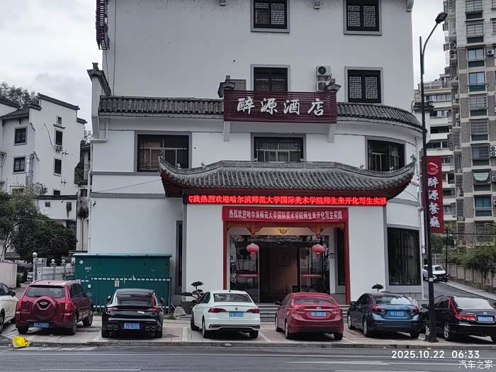 早上外出散步归来时,我拍了一张我们入住的醉源酒店的照片,照片左侧那辆红色的瑞虎3是我的车。