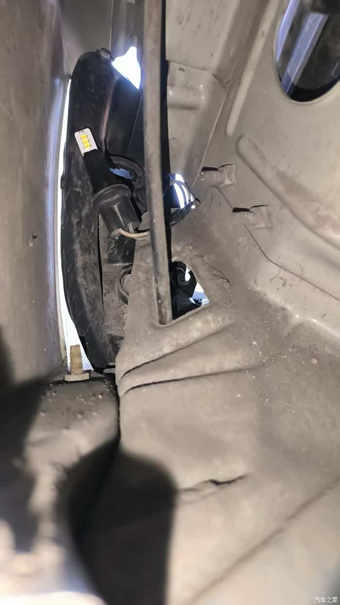 在叶子板内部安装左侧灯泡,灯座卡槽很紧,空间狭小借助小扳手才拧下来灯座,安装时是盲对卡槽,凭手感