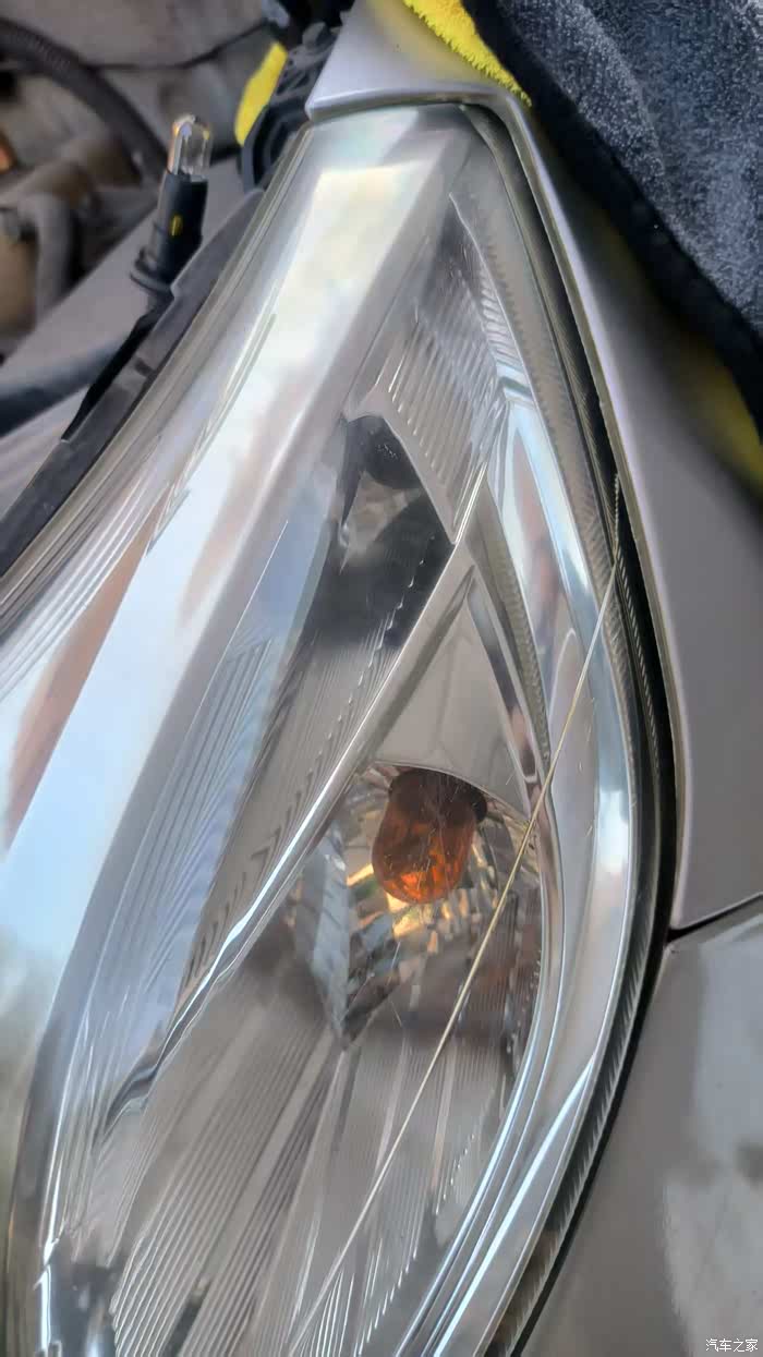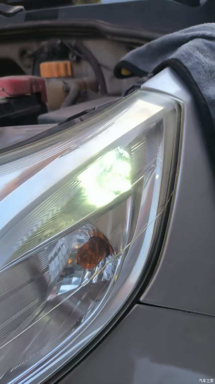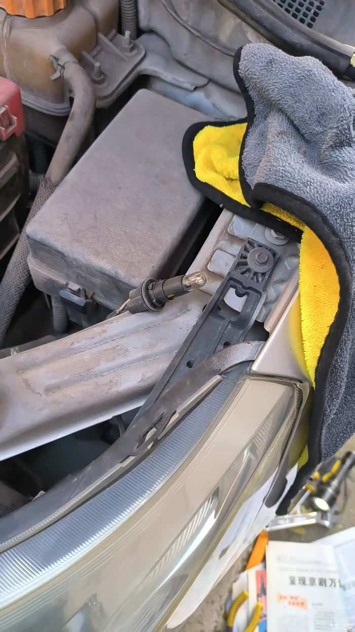 左打死方向在叶子板内部安装右侧灯泡,灯座卡槽不紧,空间狭小,得拆下右侧进气端喇叭口组件,安装灯泡底座时是盲对卡槽,凭手感