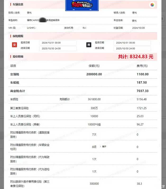 购置税:24766.37元、商业险:7037.33元、交强险:1100元、车船税:187.5元