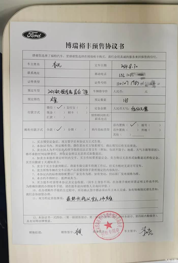 提车时间/地点:2024年10月31日,北京博瑞裕丰福特4S店
