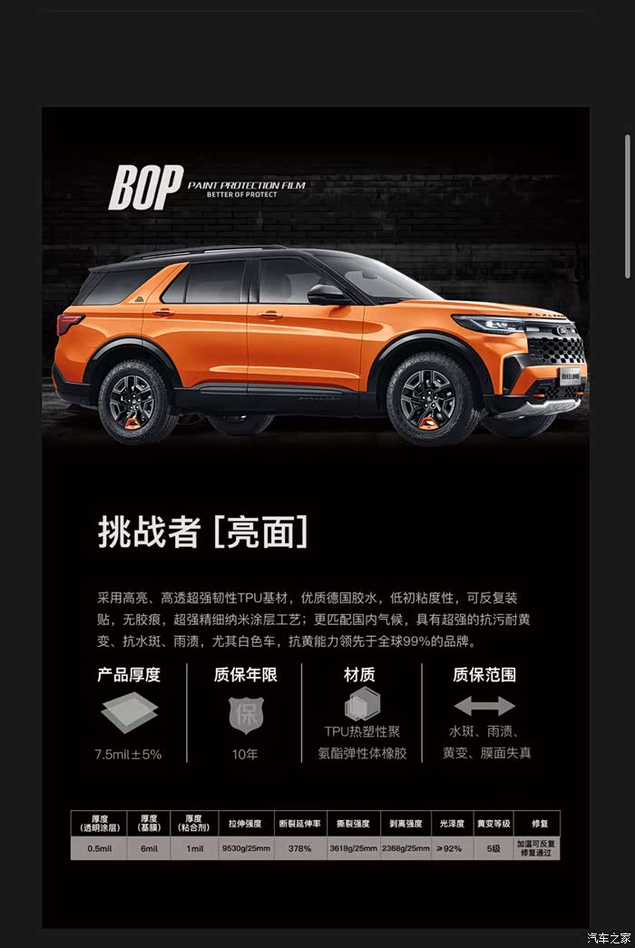 为何要给我的探险者贴BOP隐形车衣。首先,BOP隐形车衣采用TPU材质,具有极佳的延展性和耐磨性,其生产过程中的纳米涂层技术,让车衣具备自修复、抗氧化、耐腐蚀等特性,能有效抵御沙石、树枝、鸟粪等对车漆的侵蚀,保护车漆光泽.
