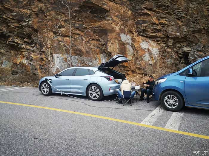 偶遇在上路上吃火锅的小情侣,电车的优势就是能反向充电,不过续航里程让人焦虑,远途出行肯定不行,还是混动更靠谱一些。