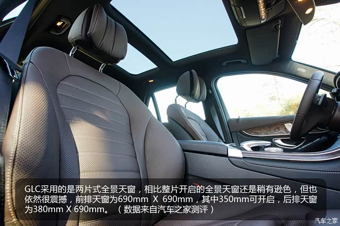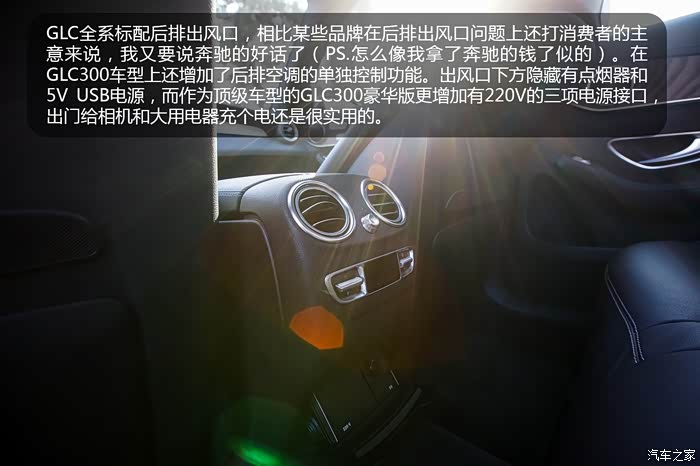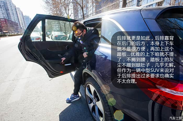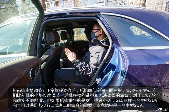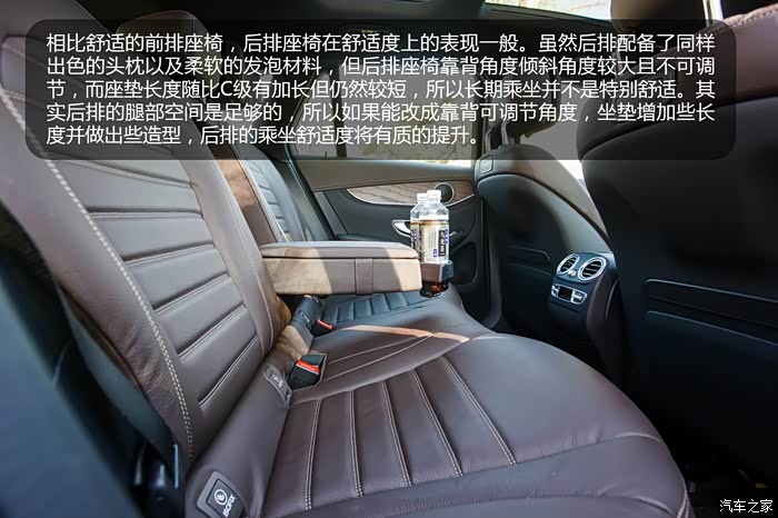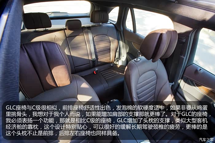 1、虽说中型SUV鲜有后排空间做的特别好的,但全新的GLC相比GLK长宽高均有增加的基础上,后排空间表现依然不够满意,主要问题包括后排靠背无法调节以及坐垫长度稍有不足;在轴距增加10余厘米的基础上,GLC的后排膝部空间已经很优秀了,所以其实完全可以把后排的坐垫做的更内凹或者更长些提供更好的腿部支撑。