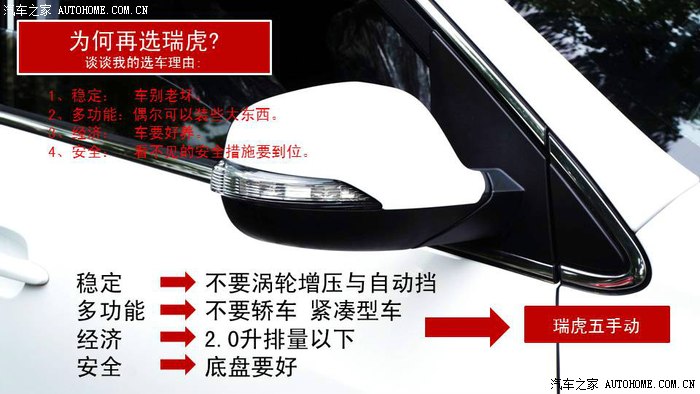 我很喜欢我的瑞虎3,它大小合适,油耗也很低,越开越爱。记得第一次选车时,心情非常纠结,到处试驾,还是拿捏不定。第二次选车时,还纠结了要不要再买大众车,最终下了巨大的决心,花了大量的心思去说服家人选择奇瑞。第三次选车,一点都没纠结,老爸老妈那里说都没说,因为他们不懂车。老婆特别重视车的音响,我那个晕啊,音响对我来说是可有可无的东西,还好瑞虎五的音响还行(行不行我只能从能不能放出声判断)。别的品牌的车我在车展上看过,主要是与瑞虎五同级别的,到于它们的4S店,真的没进去过。