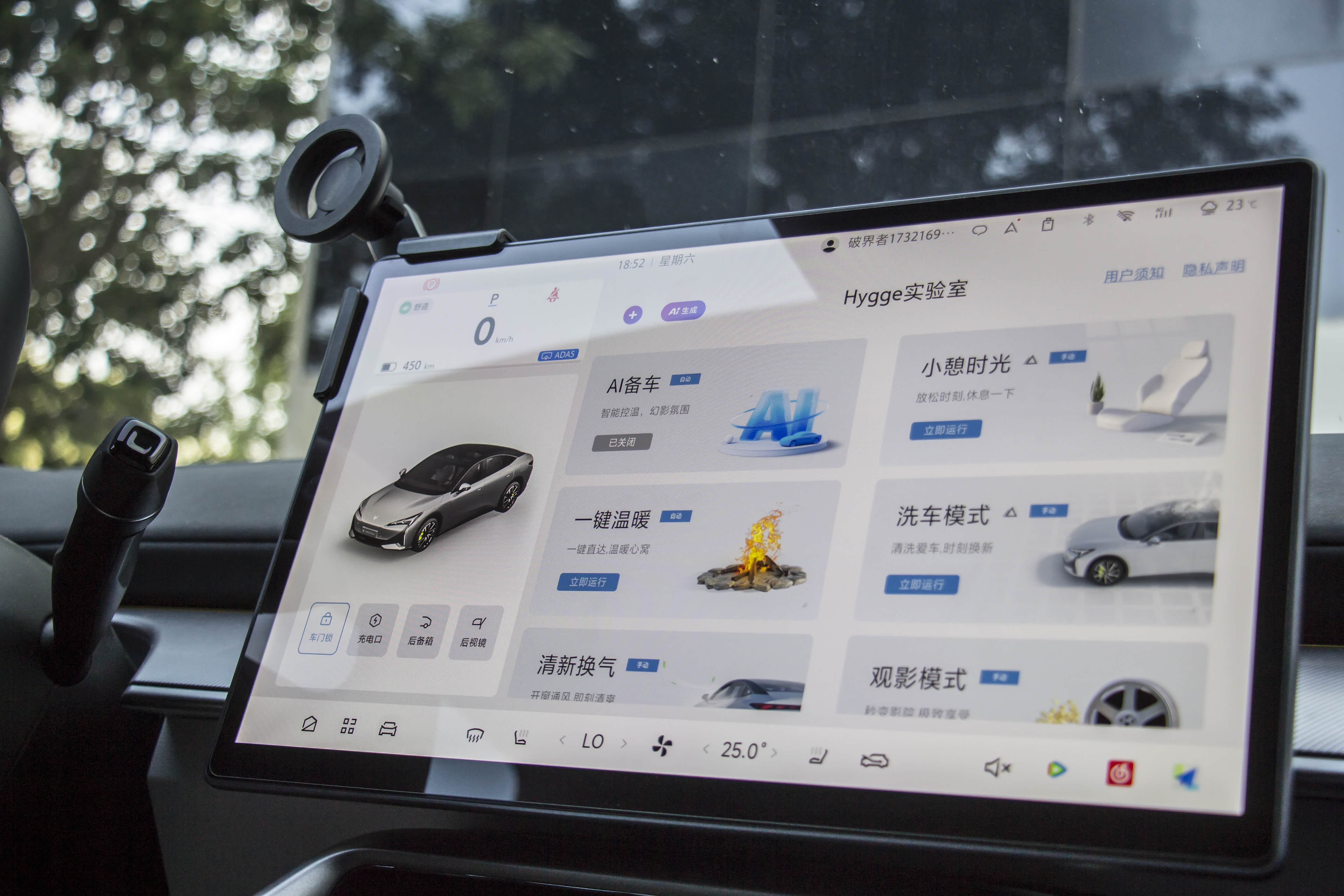 车里没有仪表盘,但有一个科技感超强的68英寸 AR-HUD 取代传统仪表盘,显示清晰,除了基础的行车信息等功能外,抬头显示随着光线强弱自动调节,而且还能观看电影,时刻迎合着你的驾驶环境。