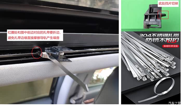 用4.6mm宽的不锈钢扎带正好适合滑槽宽度,烧热扎带头直接就可穿孔,遮阳帘安装槽边的挡片全部切掉,根据滑块尺寸对扎带需要转角的位置先折弯,把扎带与滑槽对应位置的边缘上下翻边,避免扎带边缘剐蹭滑槽产生噪音,连拆带扎一次成功,耗时1个小时,搞定收工。