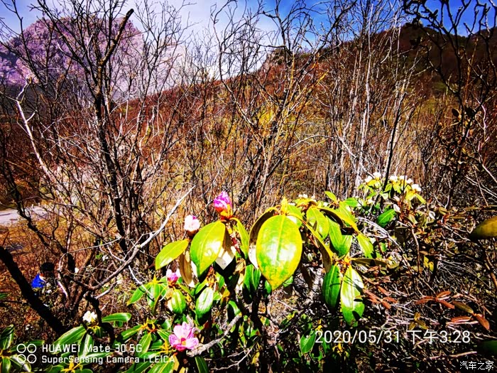,据此前行不远,突然发现左侧山洼处高山杜鹃花妖逸招展,大家兴奋地下车冲向山坡