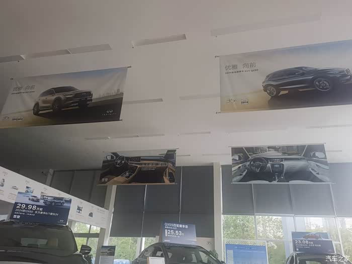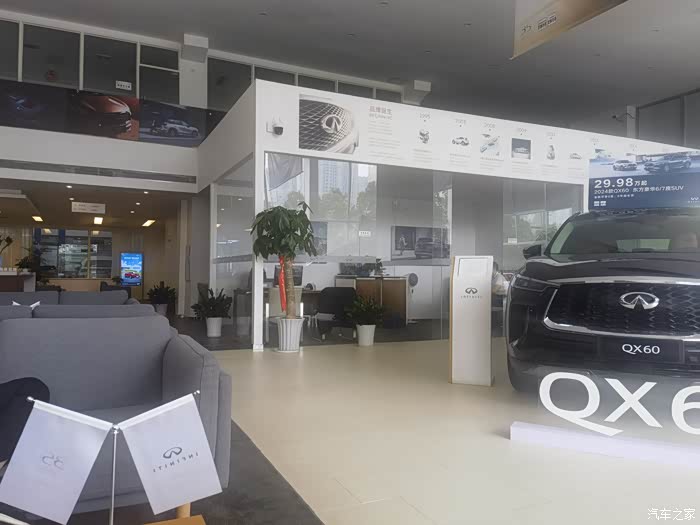 其实,对于目前英菲的在售车型来说,4s店面积是真够大了,目前在售的车就三个型号,QX50,55和60。虽然50卖的不怎么样,但是也算是目前英菲的销量担当。4s店装修得还算是中规中矩,层高高,大面积的透明玻璃,但是感觉店内照明稍微差点,没有把车照得很亮的感觉,不知道是不是因为当时店内没有看车的顾客。