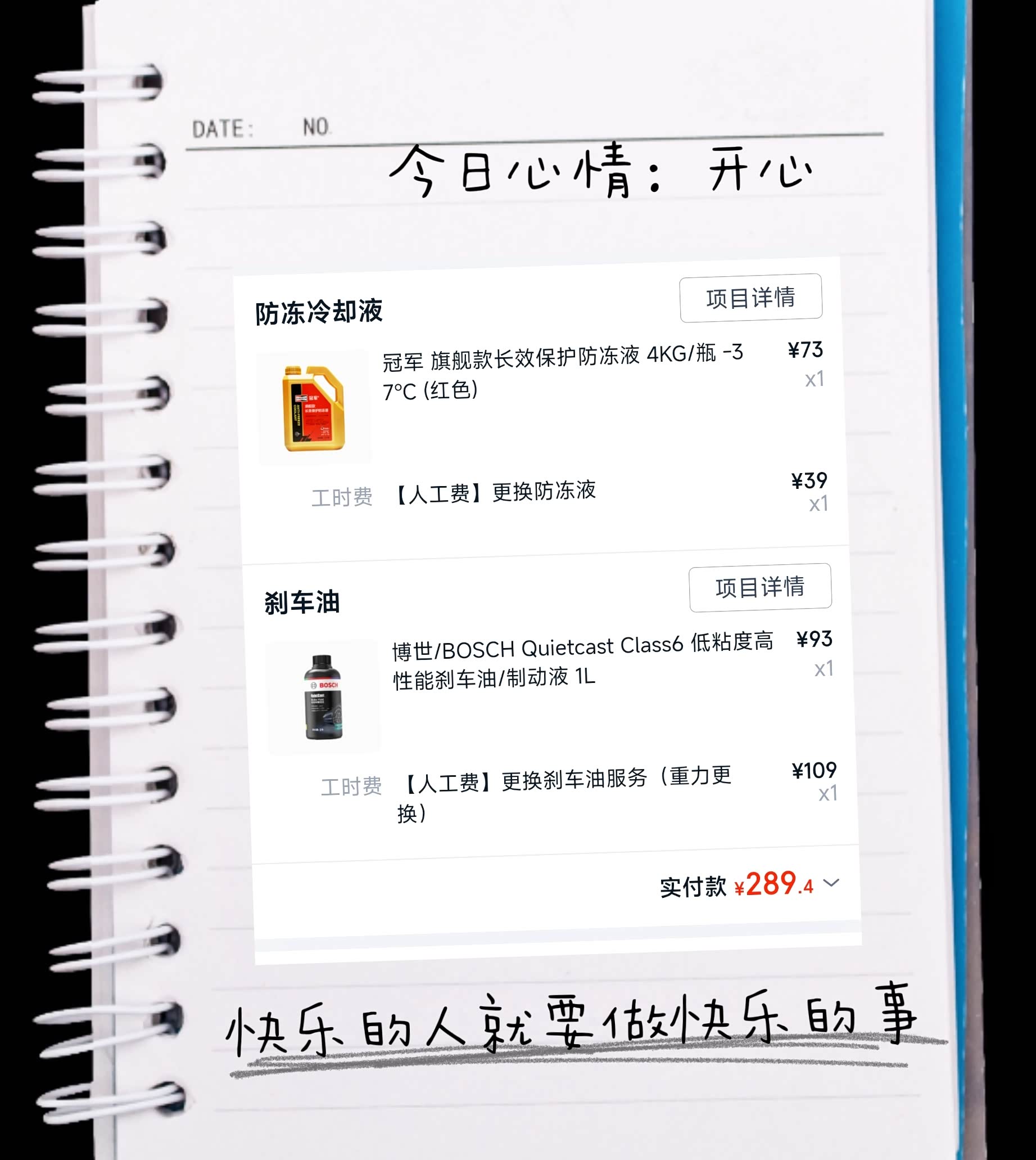 另外今年还做了刹车油更换和防冻液更换,材料加工时一共289元。保养手册有建议周期,但实际可以根据检查情况来。为了安全,果断换掉。刹车和冷却系统关乎安全,不能含糊,任何时候都是安全第一!