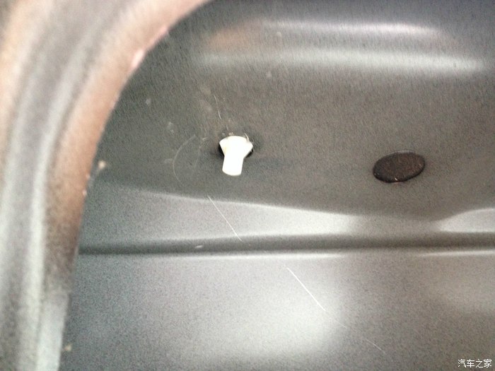 3、拆开后,我们看到的就是裸露的后备箱,然后找到我们的后备箱外饰板的卡扣,在左侧白色的一个塑料铆钉,挤一下往外面一抵就好了