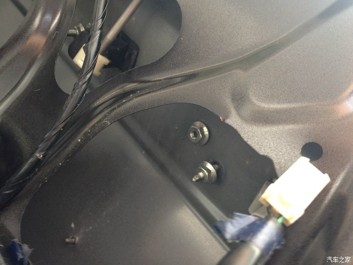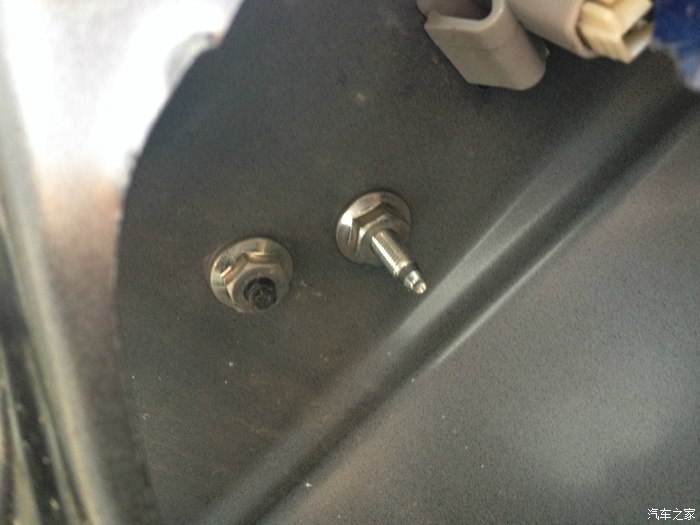 6、别漏了,在右边门锁模块的左边还有一对这样的螺丝,同理拧掉螺帽,顺便把后备箱锁那个螺丝也拧掉,这样子后备箱饰板就彻底脱离了,然后,你就可以把原来的摄像头取出来,新的装进去,卡进去就好了