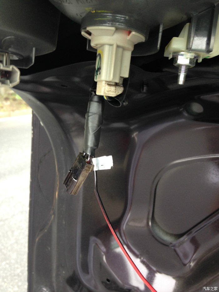 8、图中红色的电源线,也是对接头,插上去,然后把正极跟尾灯那里的正极连接,负极可以不接