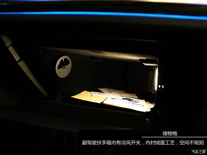 ▼副驾驶手套箱储物格内有出风口,可以吹冷风,箱内空间不太规则,比较深,内衬也是绒面工艺