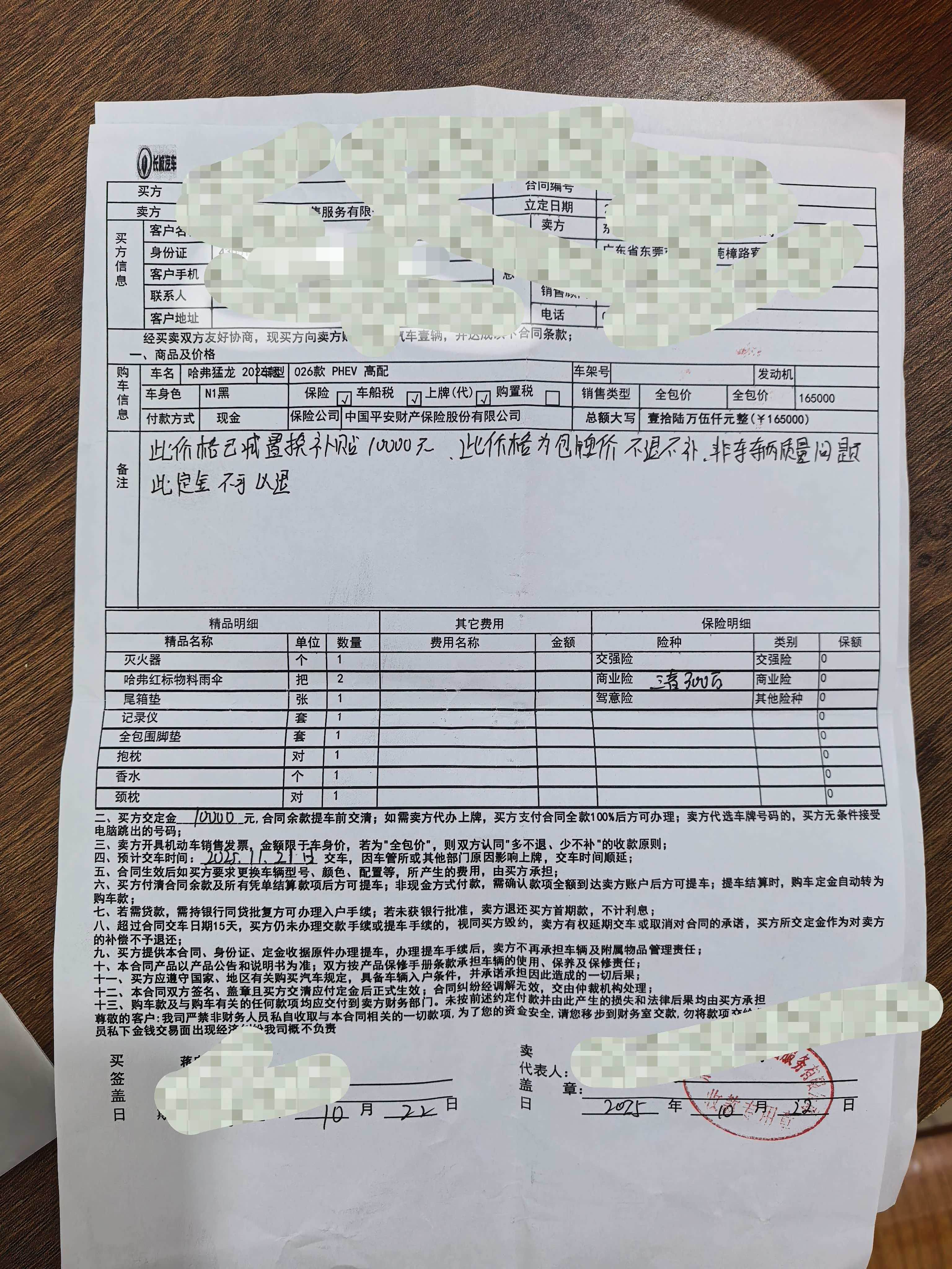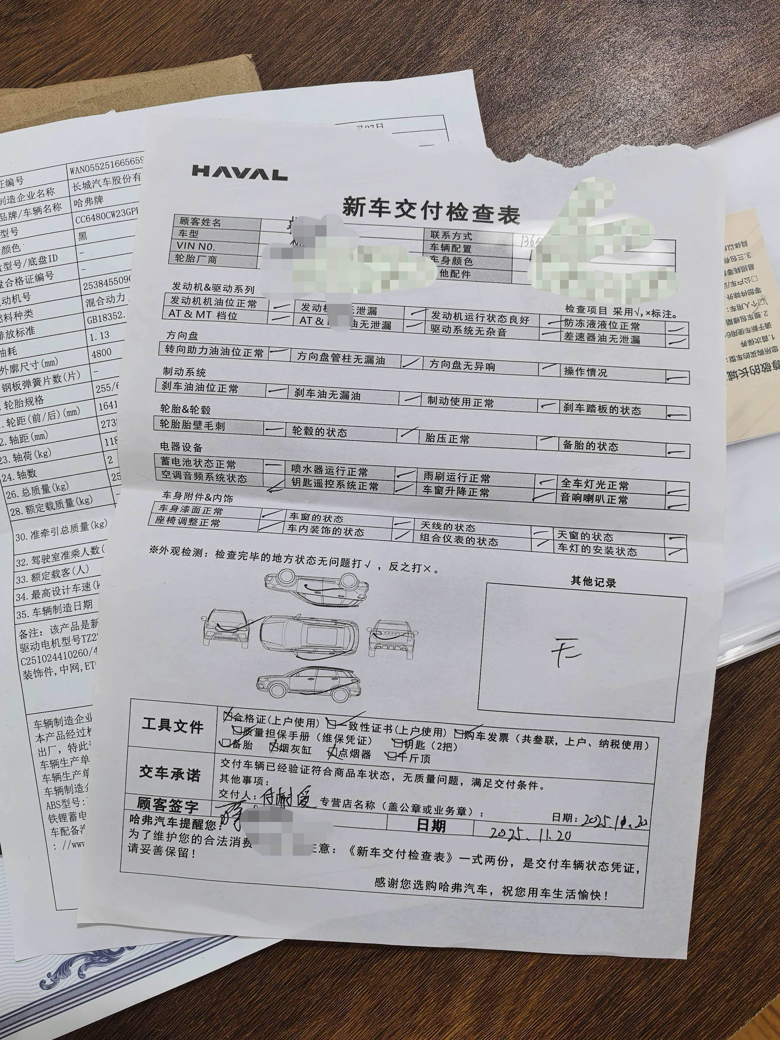 3. 文件核对与上牌:验车无误后,我才前往财务结算尾款。随后,销售将一整套文件交给我核对,包括:购车发票(三张联)、车辆合格证(原件,上牌关键)、交强险和商业险保单(确认即时生效)、车辆一致性证书、环保随车清单以及两把智能钥匙。4S店提供了代办上牌服务,我选择跟随工作人员一同前往。过程很顺利,资料齐备,验车、选号、制作行驶证和登记证书(大绿本)一气呵成,没有遇到任何额外的“套路”或费用陷阱。