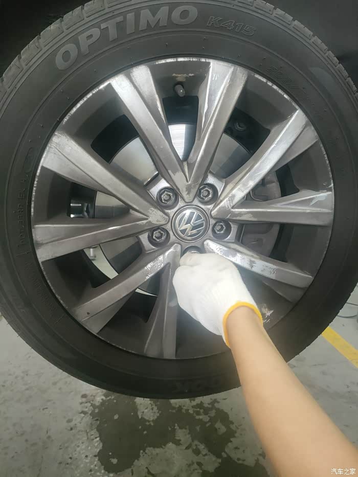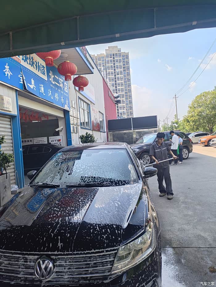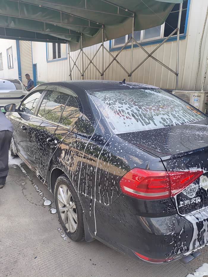 涂完水蜡洗车液后,洗车师傅开始对小朗进行全方位的洗澡了,先洗车顶、再洗车前后面,再洗车身两侧。最后洗轮毂。