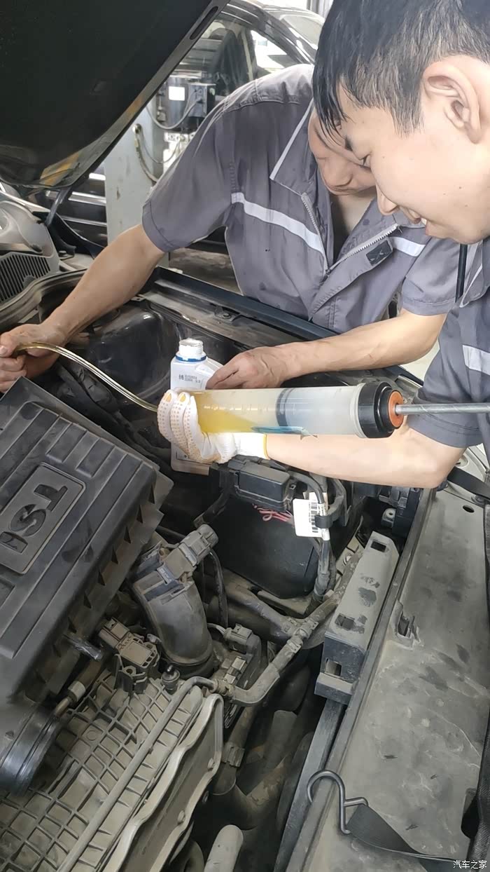 过一会,师傅把原装的2升油拿过来了,准备采用注射器的方式进行更换,我还在想,为啥我的车是换齿轮油,不是变速箱油么,怎么只换2升,不是4升么,不是采用重力方式么。师傅耐心的解答:变速箱主要分为干式、双式离合等,你用的变速箱是干式离合的,一般只换2升齿轮油够了,还有的是机箱单元控件油,那个是免维护的,不用换。