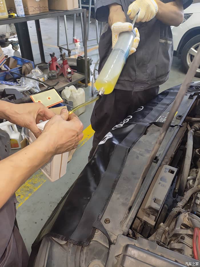 维修师傅打开机油盖后,缓慢将机油加到发动机舱内。