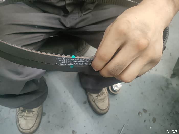 9、师傅把新的正时皮带拿过来,与旧正时皮带对比,开始标记。
