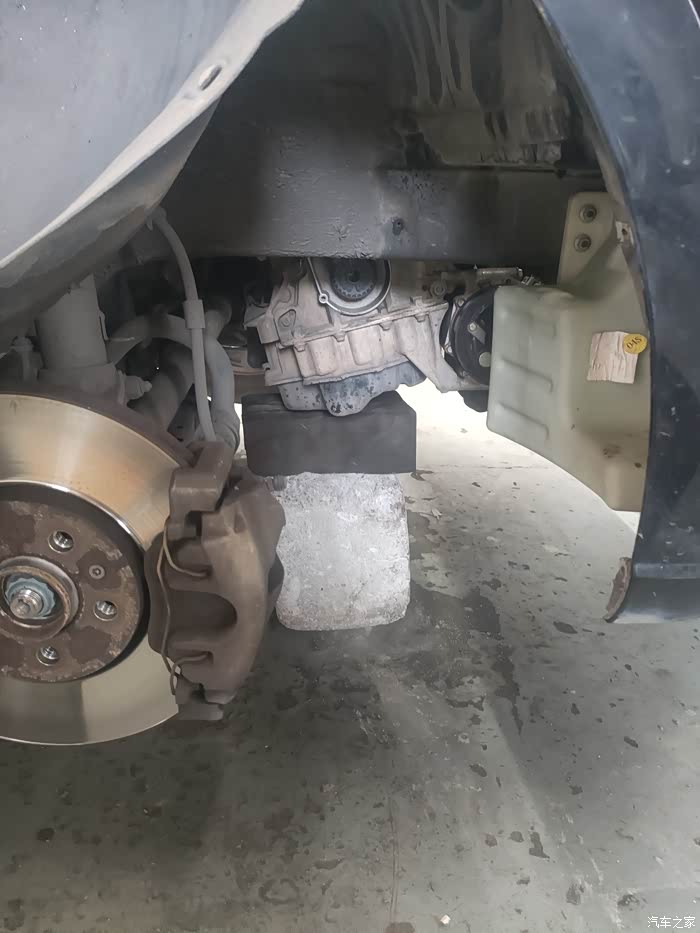 第五步:准备换汽油滤,维修师傅又开始把小朗升起来了,我就顺便检查下机油油底壳的有无漏油现象。