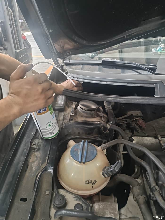 就这样小朗开始要保养了,在保养前,店维修技术打开发动机舱,先检查小朗的刹车油、冷却液、电瓶,看看小朗有无异常。目前都是正常的。