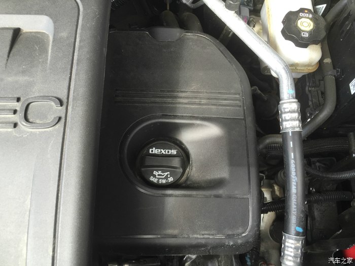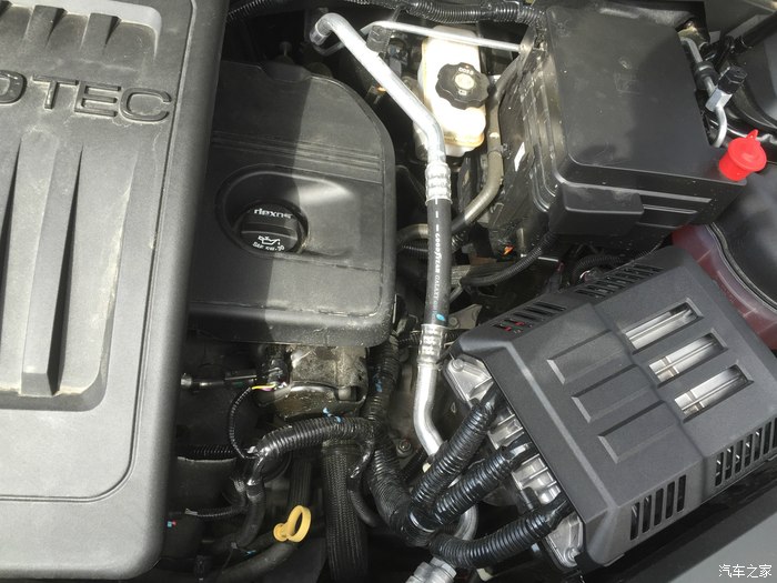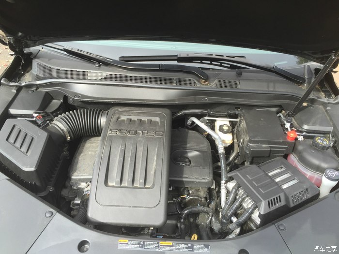 打开前盖。Equinox的发动机舱是我见过的最整齐的,模块化设计非常清晰,油路电路都有绝缘套进行保护,不像国内某神车,自诩做工精细,电路走线都是用黑胶布缠两圈了事;也不像Rav4,发动机舱里面乱七八糟一大堆,跟摆地摊似的。