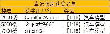 本直播帖中第2500楼、5000楼和7000楼的幸运用户将会得到【1:18】汽车模型。