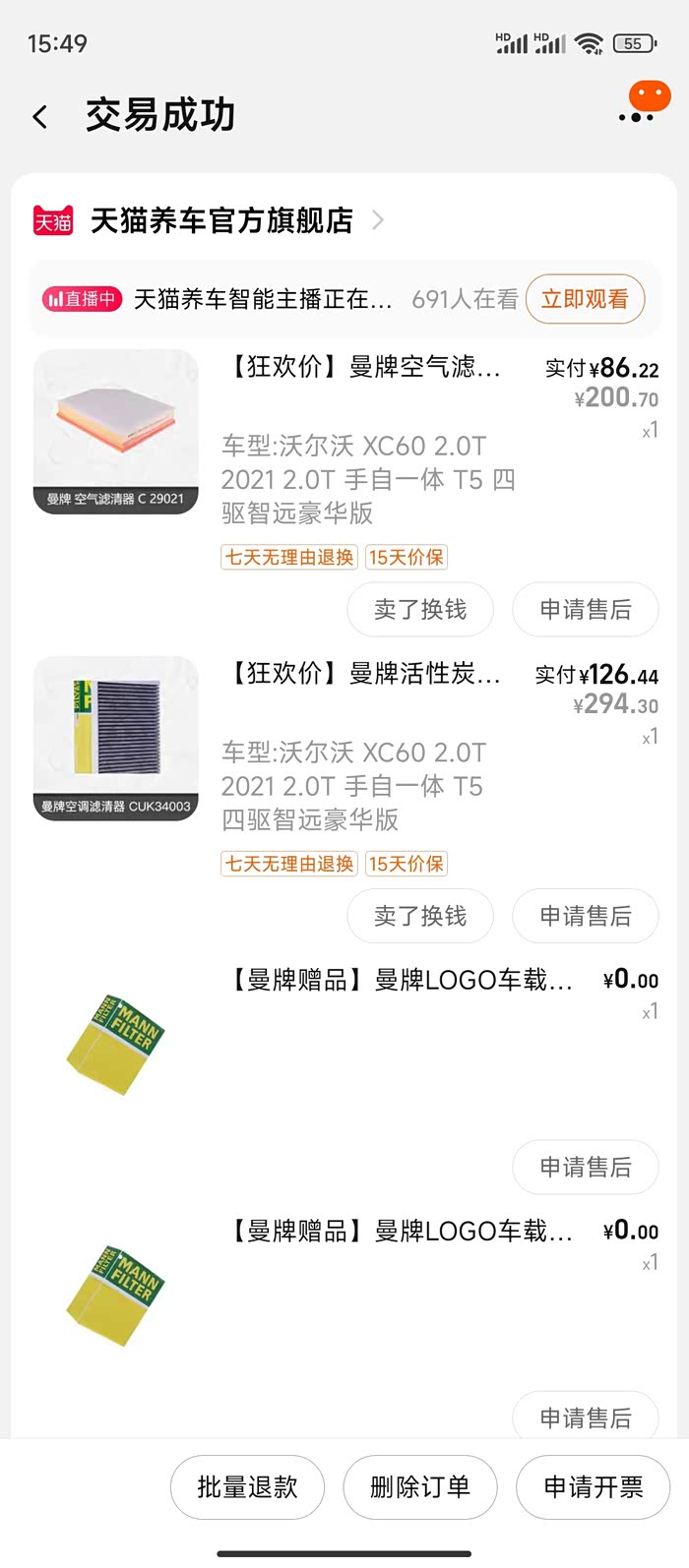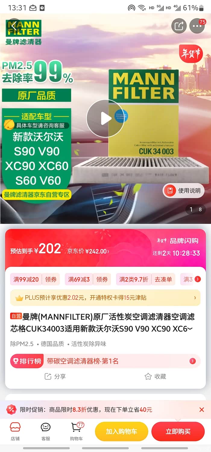 那如果已经打定主意,空调滤芯自己换,那就先要选好型号,也不难选,一搜适配21款xc60的滤芯,有曼牌和马牌,考虑到实用性(其实是便宜),我觉得马牌就够用了,于是乎89狗东到家