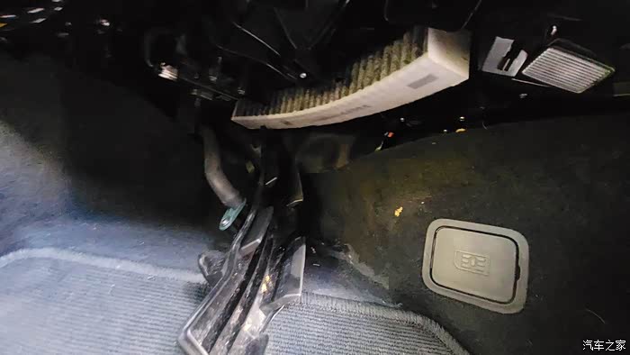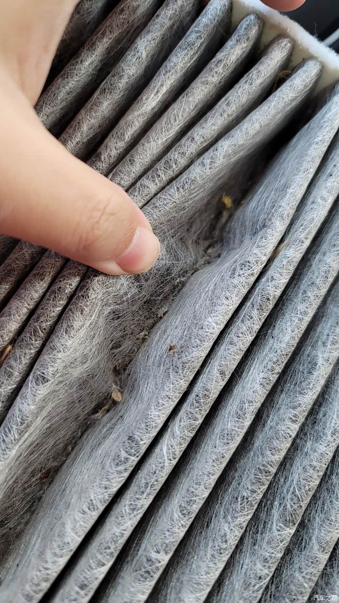 卡扣不需要卸下来,我不小心拆下来了,但是也容易安回去。。解开卡扣之后,就需要从内侧将空调滤芯的盖板给扣下来,注意只是松开就行。松开之后就能看见自带的空调滤芯了。
