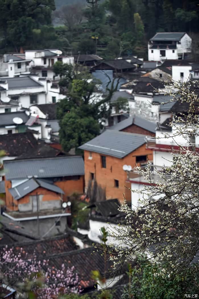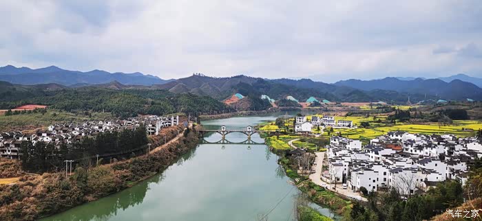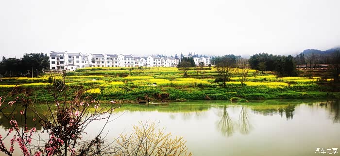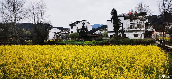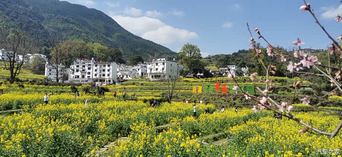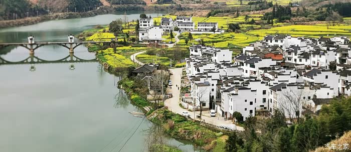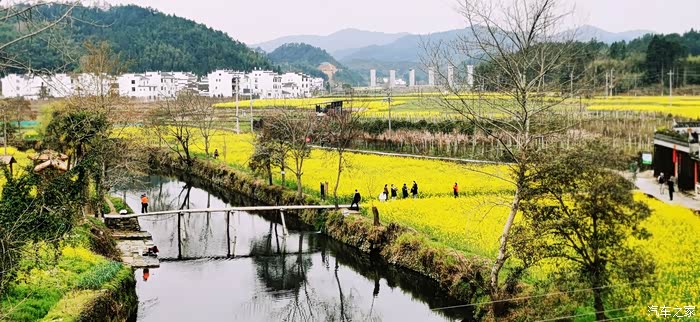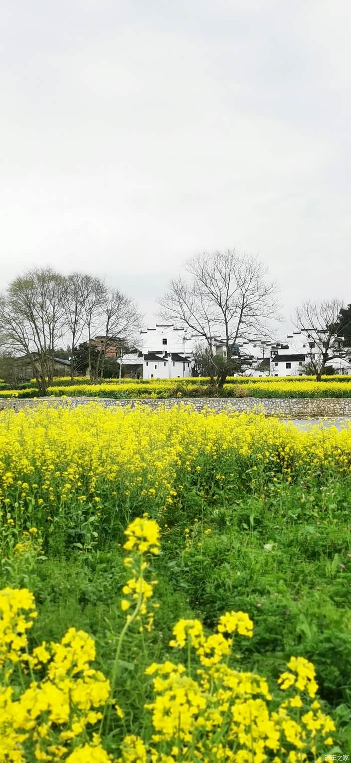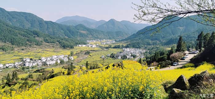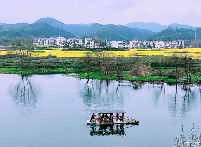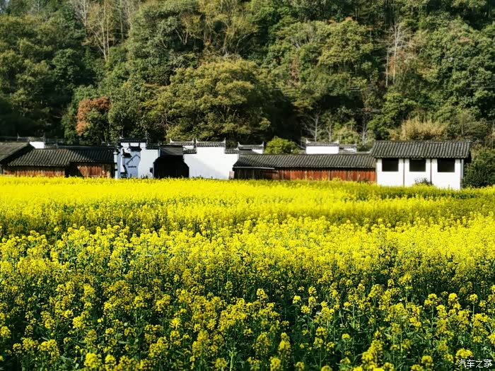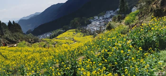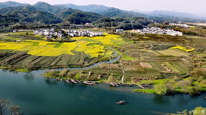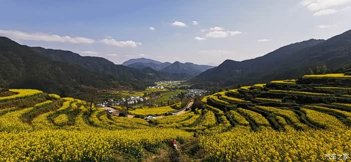 站在山顶望去,脚下大片的山谷内,油菜花开得一望无际,开得极为热烈。每多一层,就多了一分震撼。站在山脚向上望,又像是欣赏一幅立体的巨幅画作。远山、近水、粉墙、黛瓦相映成趣,中间围拢着几个小小的村落,黑瓦白墙的徽派民居夹杂在一片金黄之间。