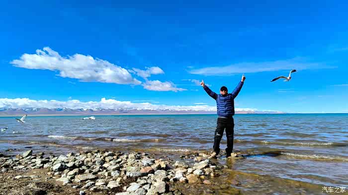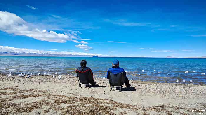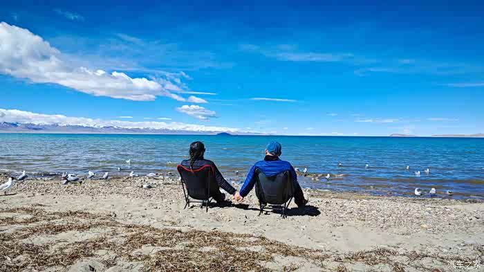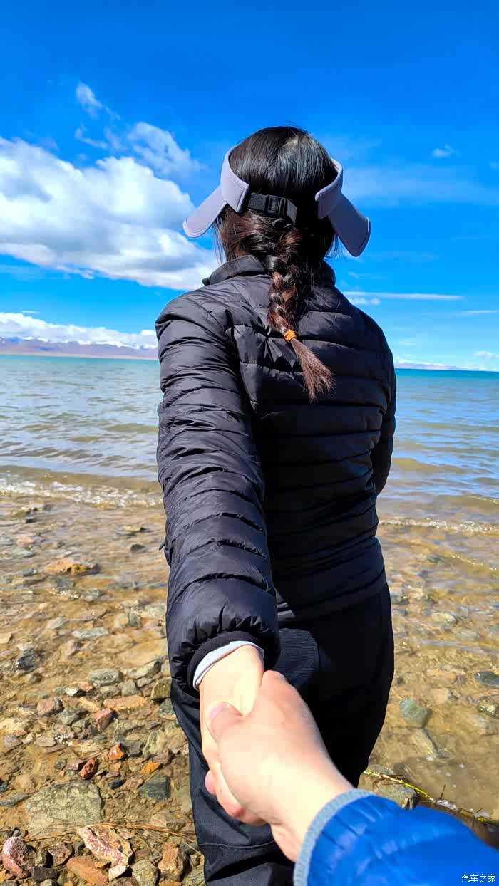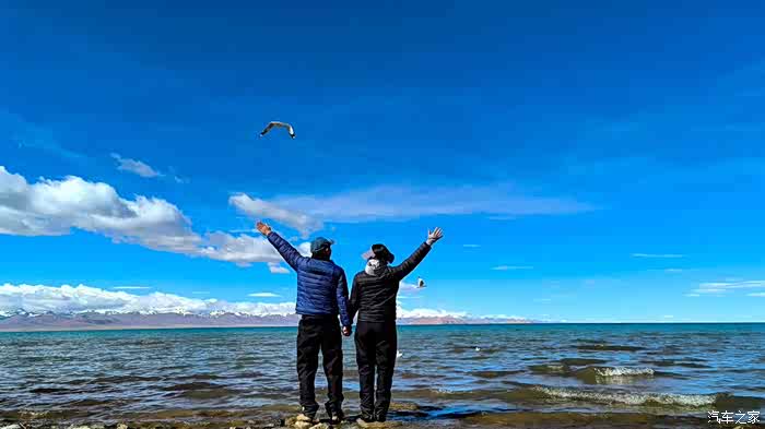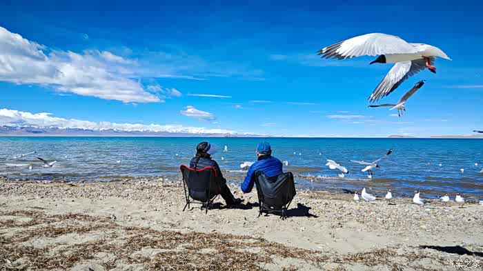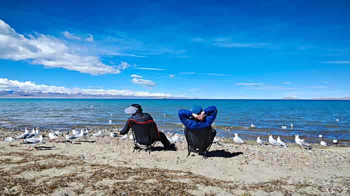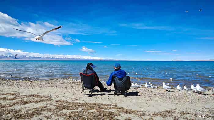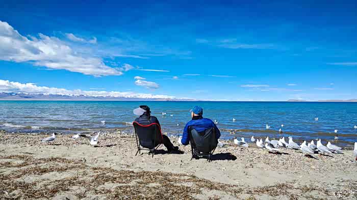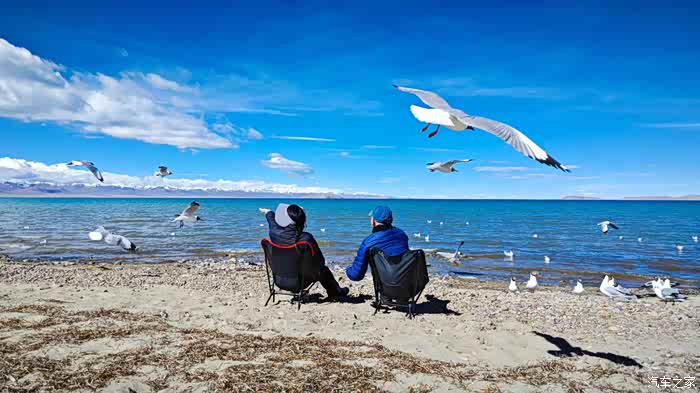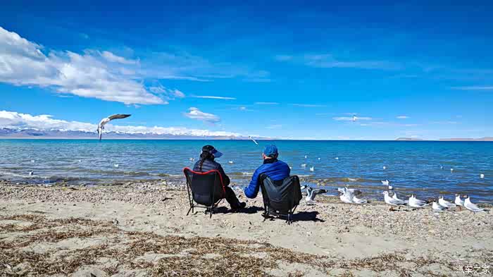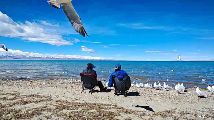 因为我们坐着太舒适了,不知不觉时间悄悄的流逝,周围的人群慢慢都消散了,也是哈,高海拔顶着晴日,加上再站着,确实不能呆太久。那些红嘴鸥们就开始围着我们俩了,翻遍口袋,还好有一袋酒鬼花生,省着点喂吧。整片湖岸,就我们俩人悠悠的喂着鸟群,阳光虽然毒辣,好在防晒措施蛮到位,穿的也足以应对气温,高反也没有,就这状态,简直能在湖边一整天呀。