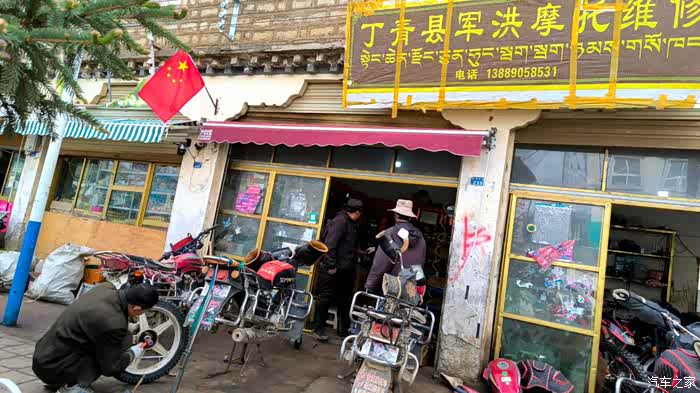 扯远了,出了 丁青 差不多一个小时,翻过琼捏拉山口,有个观景台。在那里小憩,团长去照相,我没事观察一下车况,发现后尾箱的固定螺丝少了一个。另一边的螺丝还没怎么松,说明这边的螺丝刚掉不久,还好发现及时,不然啥时把尾箱跑掉都不知道。于是缓缓滑下山去,到了山脚有个色扎乡,便拐了进去,边走边看,还真看见一个摩托车维修铺。停下来去问老板,有没有10个大的螺母啊,老板说那个箱子里,自己找。我去划拉翻找着,老板进来问, 四川 的?我说是啊。老板又问 绵阳 的?我一下笑了,这口音熟啊,反问老板,你也是 绵阳 的? 绵阳 哪的?老板说 江油 。我更乐了,高声叫团长说,媳妇快来认老乡啦。