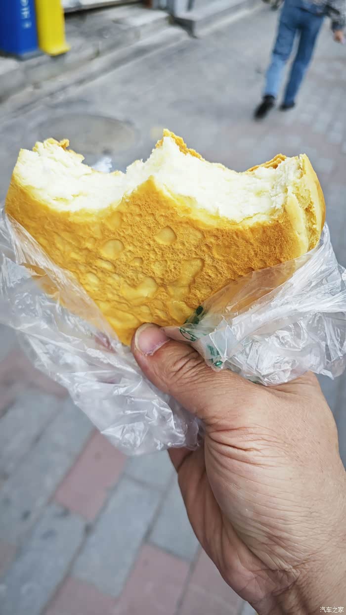 我们住的酒店外面卖的这个饼子,买个尝尝。店员告诫我说这个很干,你吃的时候一定要确保有饮料或者茶水在手边。我拿在手上仔细端详,看起来泡泡的,也不硬呀,不过我很听劝,备了一瓶水。确实不喝水就咽不下去,但是蛮好吃的。