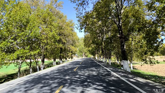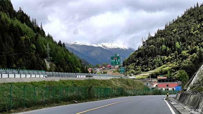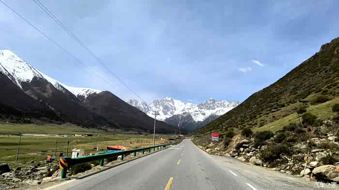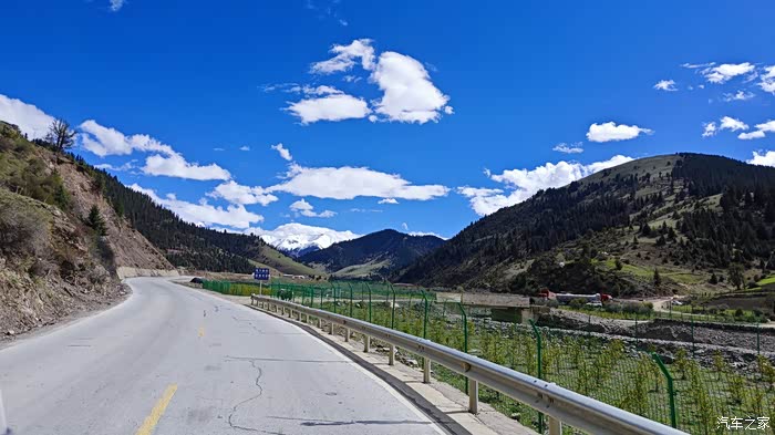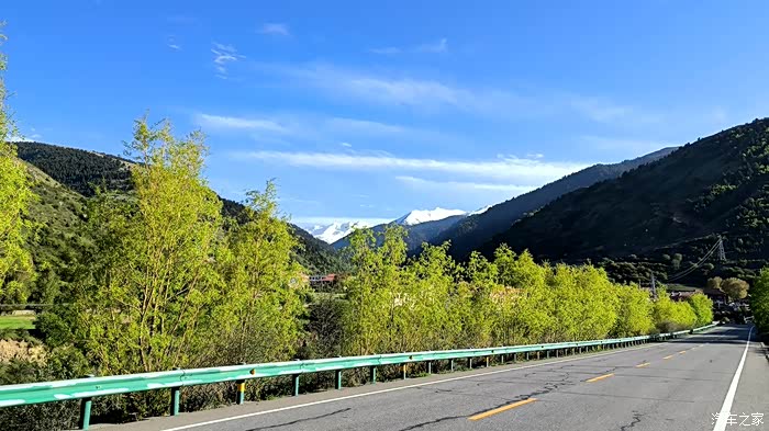 出 甘孜 县,踏上进藏的旅途,难得一阵有两旁的行道树,其实更远的外面就是一排雪山