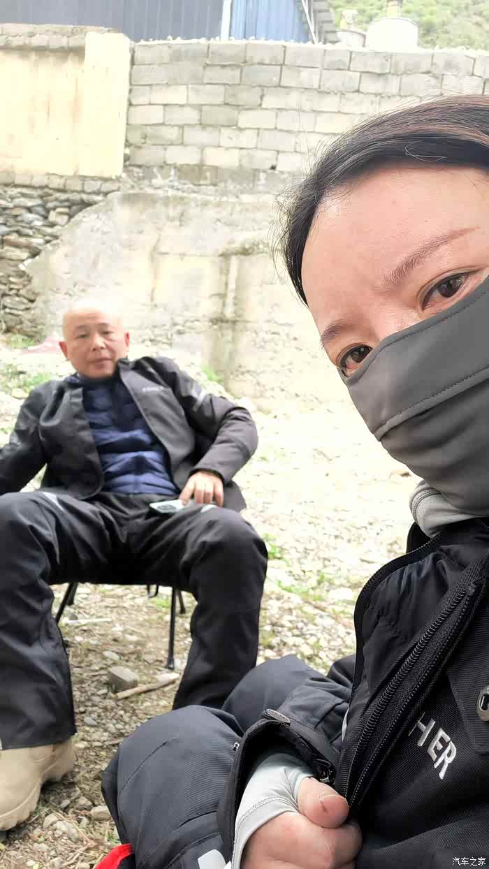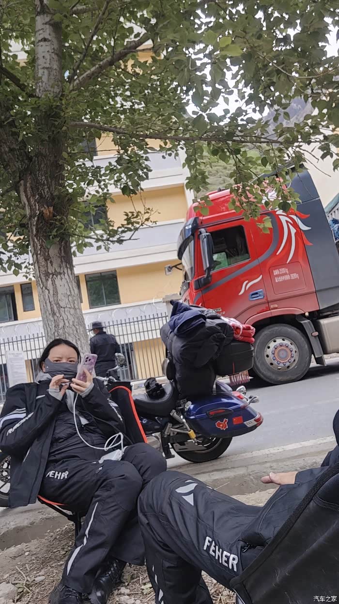 翻过雀儿山,慢慢下到河谷地段,有一小段修路地段在交通管制。摩托车就这点好,溜到最前面。打听到还有半小时才放行,于是拉开椅子,坐下休息。前面凑起了好几拨摩友,一拨是 南充 的露营去 新疆 三个摩友,打头的老哥是个力帆V16,你看下面图上这一堆装备,看着就繁复呀,这每天收啊展的,一两天无所谓,长时间其实真的消耗人的耐心。露营的话,其实每天里程就最好也就两三百公里了,不然精力扛不住啊,这是有闲人的玩法了。像我们这种假期有限的人,还是只有闷头赶路呀。另外两个 广东 车牌的摩友,然后一个 湖北 武汉 的两口子,是个雅马哈300。嗯嗯,难得也是像我们一样的单车两人呢。因为就想抓紧时间休息,也没特意去搭话。快要放行的时候,又来了湘牌的非双,也是两口子一个车。今天算是凑齐了情侣款摩友呀。