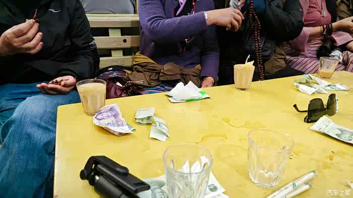牌牌是藏面,零钱是柜台专门换出的,用来给茶钱,一元钱一杯,喝完再买,只要有零钱在桌上,杯子空了就会有人来续,随你坐多久。