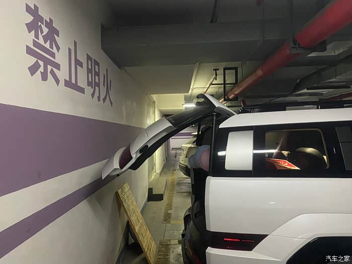 那就是倒车影像上的红色停止线,因为停车位的划线规定是不能小于50cm,所以只要倒车影像上红色的停止线不超过车位的划线,后备箱打开就不会更后面的墙发生碰撞。