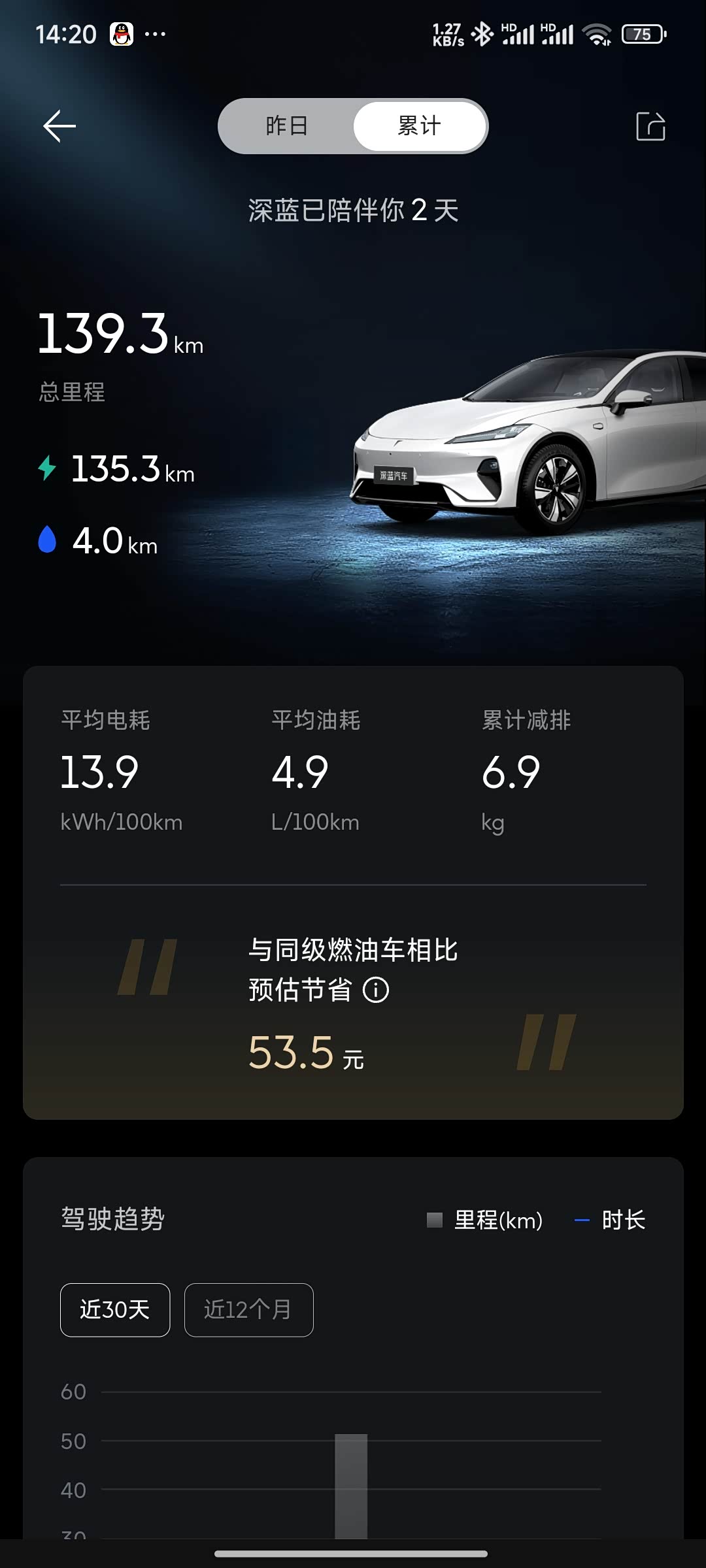 。今天是第三天开这个车车,上一个车是油车,在节能技巧方面还不是很熟悉,不过就这三天驾驶与油车相比的话,节能技巧应该有一些相同的地方:长下坡开启强动能回收(类似于油车下坡尽量控制匀速,减少刹车油们使用);非极端天气用通风模式替代 AC(减少乘客空调使用,尽量使用自然风),车机实时监控功能可精准显示各电器能耗占比,让每一度电都物尽其用。最后我附上几张深蓝APP截图以及车中控屏照片,反正车子这个系统还没完全熟悉,开车的时候车技系统界面这些都看看,还有老车友有啥好的使用建议请尽量给我提一提,能让我少走一点弯路也是好的。