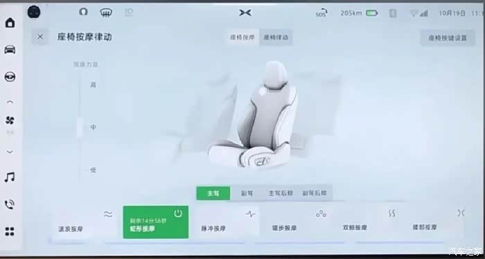 6.座椅设置:座椅按摩:小汽车图标→常用→座椅按摩律动,设置前排和后排座椅的按摩力度,还能选择不同的按摩形式。