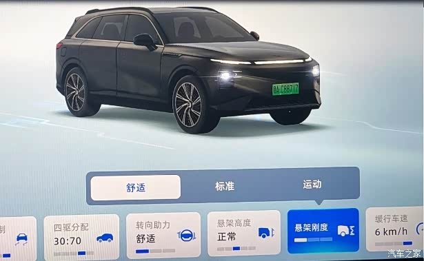 空气悬架设置:小汽车图标→常用→悬架调节,设置悬架高度、悬架迎宾(上下车辆时自动调节高度方便进出)、轻松载物(降低后轮悬架高度,方便装卸物品)等功能,可以稳定性通过坑洼地带。