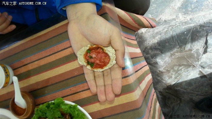 说下这个生牛肉酱,这里就是用生的牛肉拌到辣酱里,然后包在糌粑里吃
